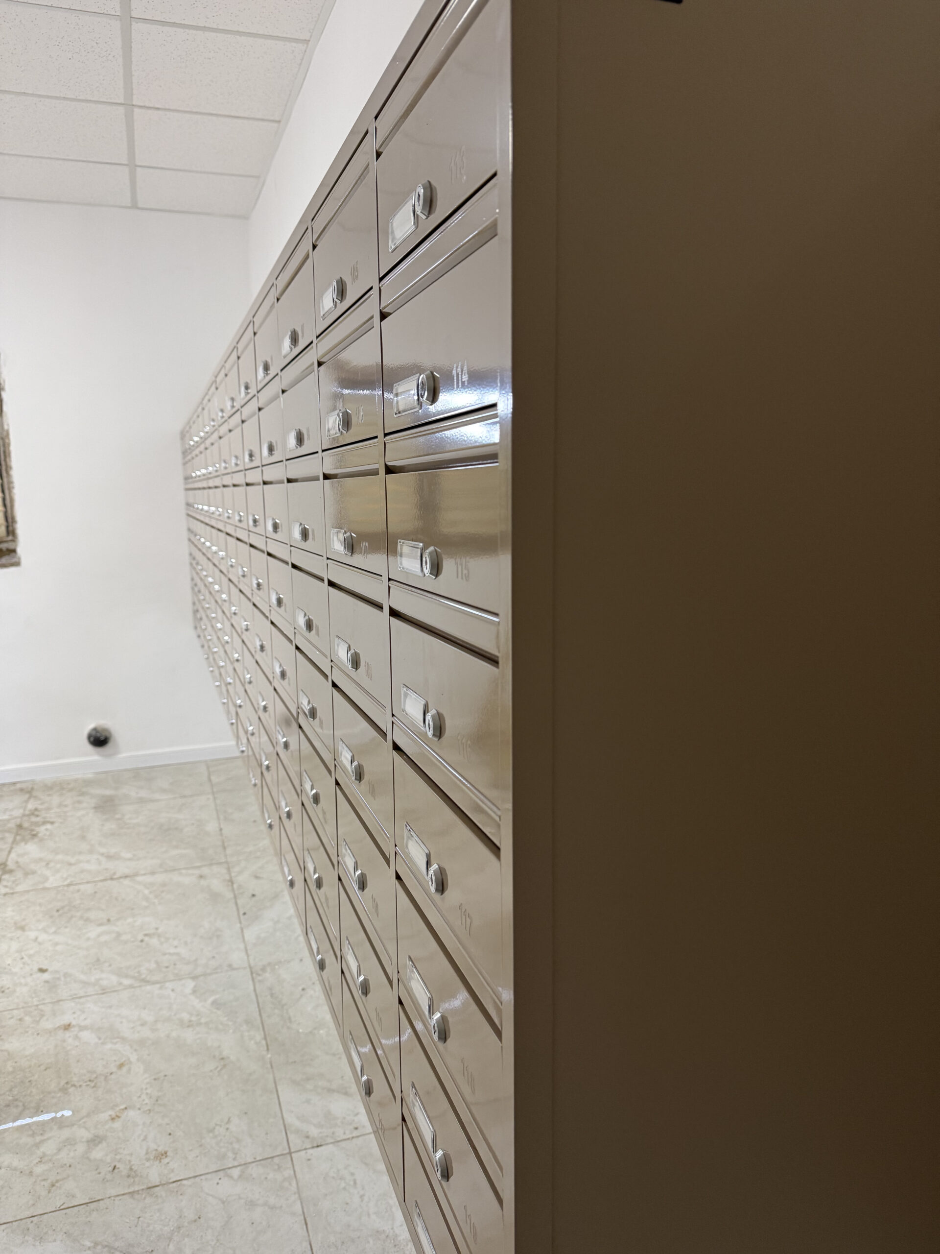 במסגרת הפרויקט התקנו מערכת תיבות דואר מדגם D1020, המותקנת על מעמד עם עמודים בגוון RAL 9005 שחור מט. המערכת שולבה בנישה מיוחדת, שצבועה גם היא בגוון שחור, מה שמדגיש ומבליט את העיצוב היוקרתי של התיבות בצורה מושלמת.