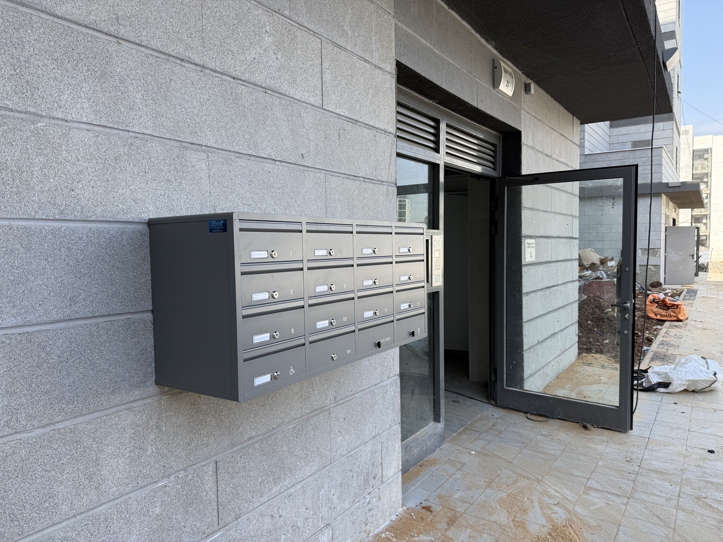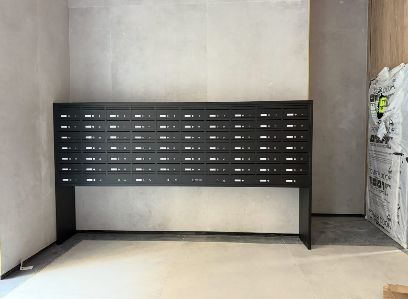 אופן ההתקנה: מותקנות על קיר בשילוב מעמד על עמודים תכנון מדויק ופתרון לשילוב תיבות הדואר כחלק מרכזי בלובי הבניין