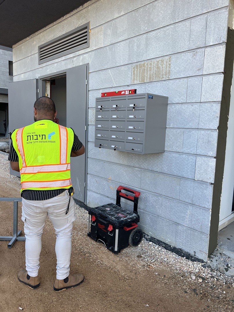 סיום של פרויקט גדול בכרמי גת. מערכות תיבות דואר לפי התקן הישראלי לשכונה שלמה, 800 יחידות דיור, מותקנות על קיר בגוון RAL 9007.